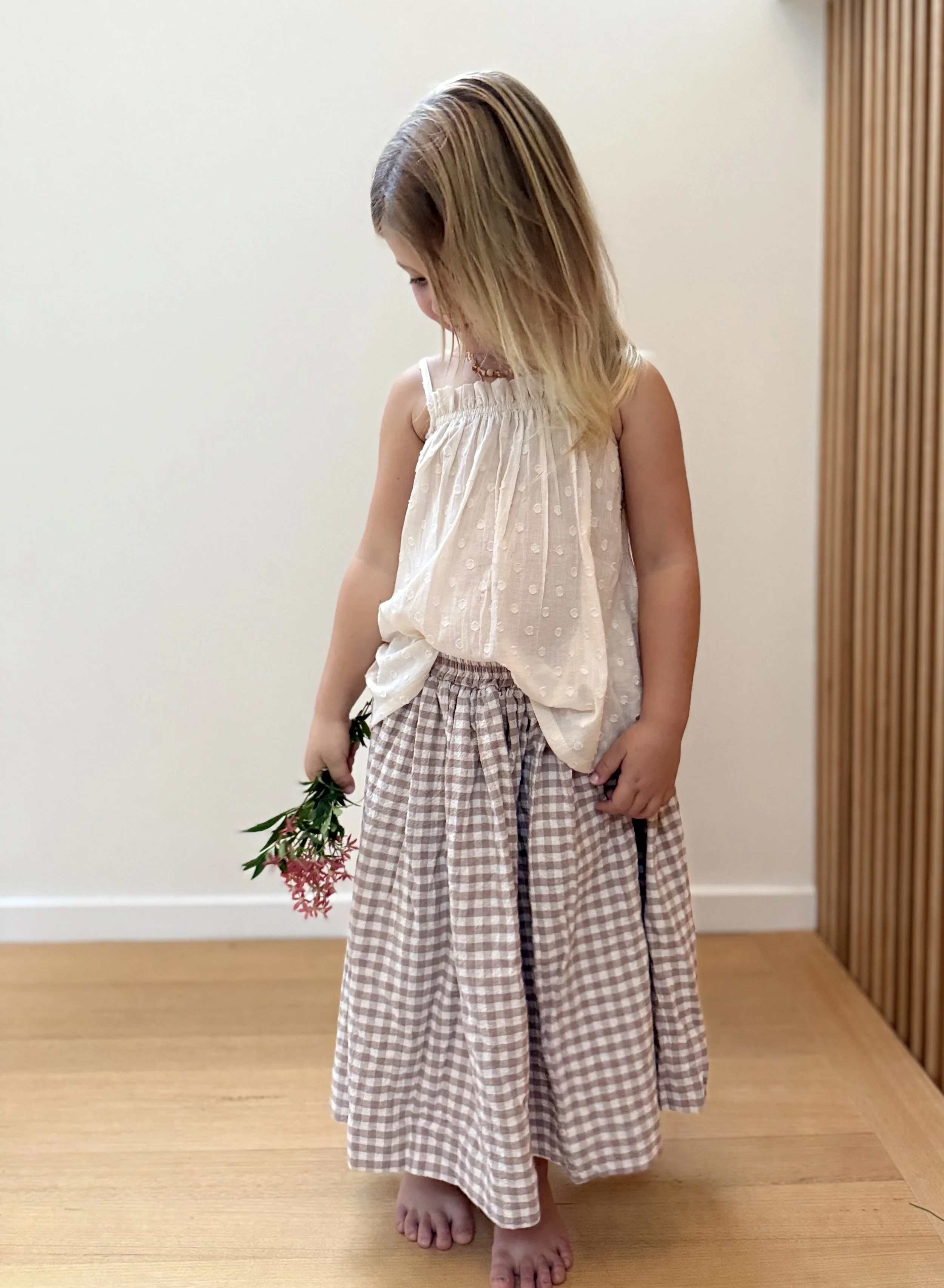 Our favourite long skirts are back in textured cotton gingham.